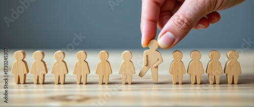 wooden human icons lined up on a table, a hand picking one figure to represent hiring and uniqueness, simple background, macro shot, professional corporate concept illustration.