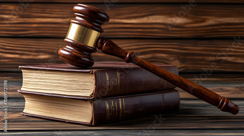 Wooden judges gavel resting on legal books in courtroom setting