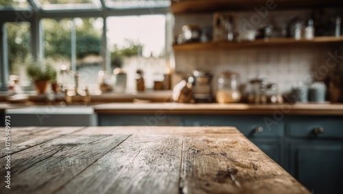 Wooden kitchen table top, blurred background of a light-filled kitchen with cabinets and windows