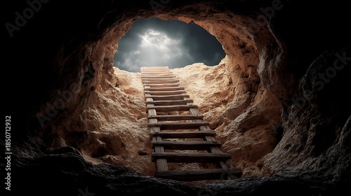 Wooden ladder leads upward from dark cave towards bright light. Represents hope for change new beginnings. Journey, exploration path from darkness to illumination, light hope.