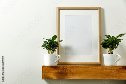 Wooden old shelf of free space for your decoration and white cups of coffee plant.