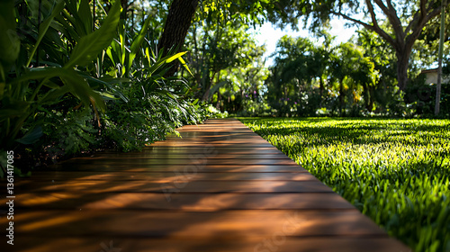 Wooden Pathway Through Lush Green Garden Under Bright Sunlight with Trees and Plants