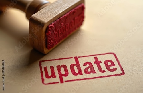 Wooden rubber stamp with red UPDATE text. Concept for new version, recent changes, revision, refresh upgrade. Office tool for documents, paperwork. Modern info update concept. Approved, accepted,