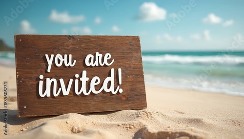 Wooden sign with you are invited text stands on sandy beach near ocean waves. Blue sky with clouds. Summer day invite for party, event, wedding.