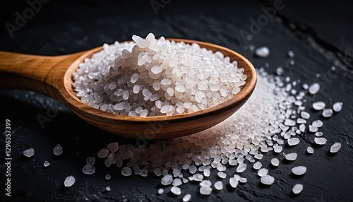 Wooden Spoon Full of Coarse Sea Salt Crystals on Dark BackgroundA Close Up Image