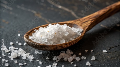 Wooden Spoon of Coarse Sea Salt on Dark Background, Close-up Photography, Culinary Concept, food photography, sea salt Sea Salt, Food Styling