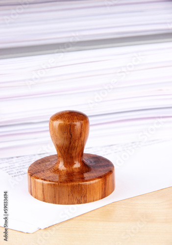 Wooden stamp and papers on table