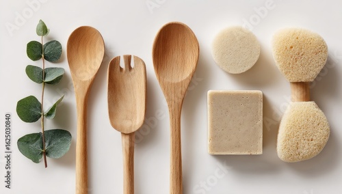 Wooden utensils and natural bath products on a white surface