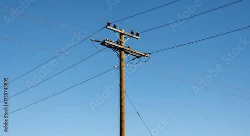 Wooden utility pole with high-voltage wires against a clear blue sky