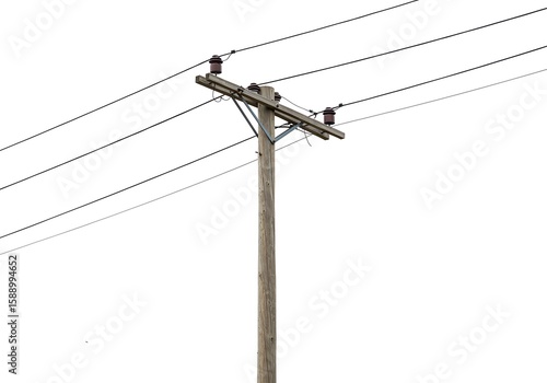 Wooden utility pole with multiple power lines and insulators isolated on white background
