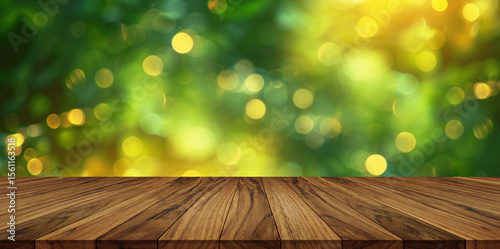 Wooden worktop with soft green bokeh background and natural light, ideal for product display.