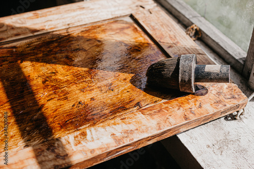 woodwork, processing of solid wood with varnish and epoxy. Handicraft artisan.