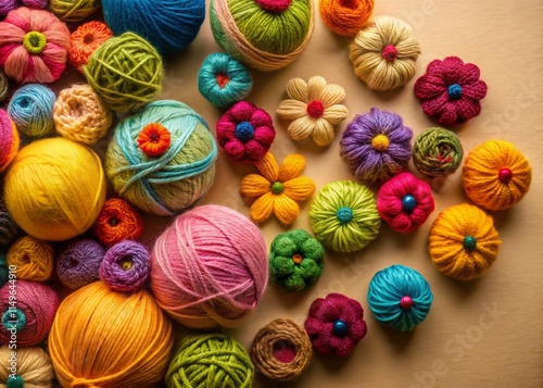 Wool Balls, Knit Flowers, Beige Background, Aerial View