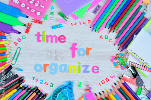 word letters time for organize and stuff for school on desk