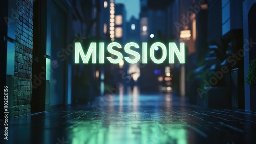 word "MISSION" glowing letters with green and blue hues and text floats on transparent see through a blurred background,generative ai
