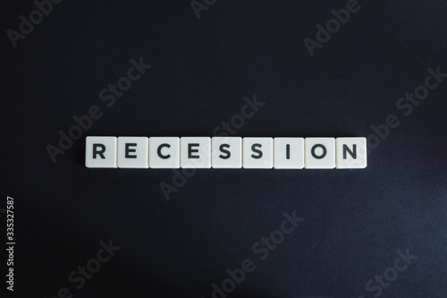 Word Recession made up of block letters on black background. Concept of global economic crisis.