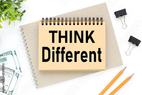 Word Think Different. Table top view with notepad, pencils, bills and plant with copy space on white table background