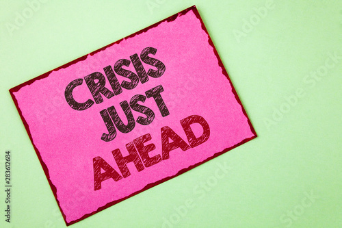 Word writing text Crisis Just Ahead. Business concept for Foresee failure take right action before it is late written Pink sticky note paper plain background.