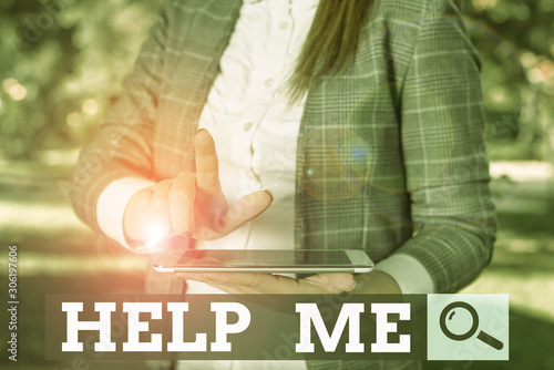 Word writing text Help Me. Business photo showcasing Asking someone to assist you Shouting for it Teamwork Volunteer Outdoor scene with business woman holds lap top with touch screen