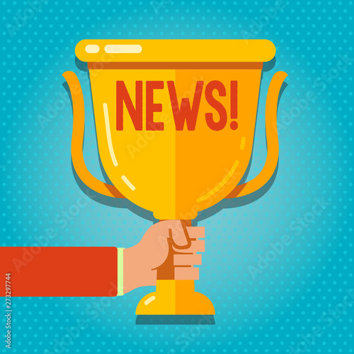 Word writing text News. Business concept for Report recent events Previously unknown information Hand Holding Blank Golden Championship Winners Cup Trophy with Reflection.