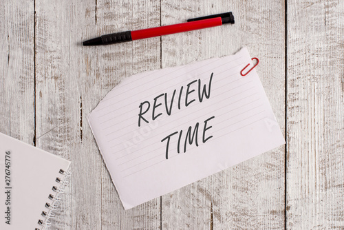 Word writing text Review Time. Business photo showcasing to think or talk about something again Set schedule to review Torn paper and notebook sheet with a pen placed on top of wooden table