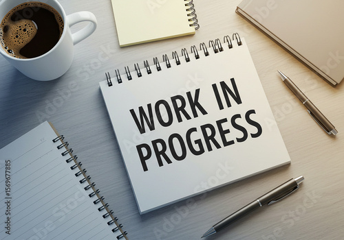Work in progress concept image for business planning and project management with coffee and stationery on desk