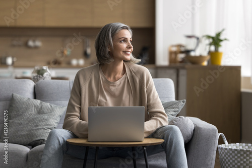 Work productivity and domestic comfort. Happy mature woman freelance worker use notebook pc at cozy home office creating project plan text sitting on comfy sofa inspired with concept idea found online