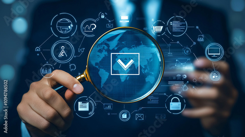 Work Safety and Compliance Concept. Businessman holding magnifying glass with icons work safety, compliance, risk management, and operational efficiency, emphasizing importance of safety