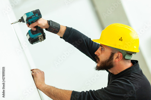 Worker builds a plasterboard wall.