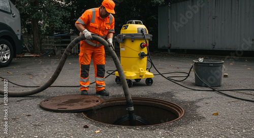 Worker Cleaning Sewer with Industrial Vacuum Cleaner