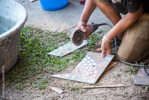 worker cutting a tile using an angle grinder at construction site
