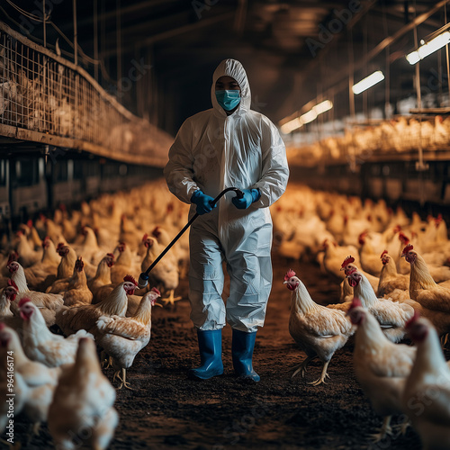 worker in a protective suit, mask, and gloves in a poultry farm. They're standing amid a large group of white chickens, holding a hose or a tool for tending to the birds.