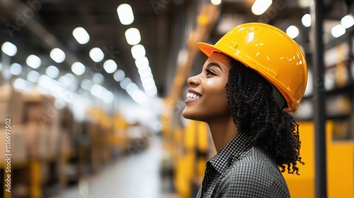 Worker in a warehouse wearing a safety helmet and smiling while taking a break in a well-lit industrial space