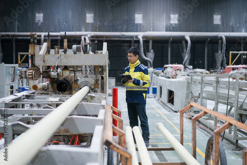Worker in factory workshop operating equipment and inspecting pipelines