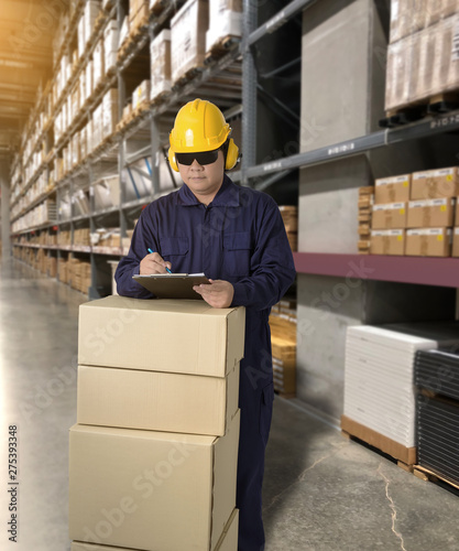 Worker in Mechanic Jumpsuit with holding parcel boxes