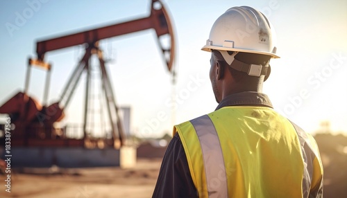 Worker in Protective Gear at Onshore Oil Pump Site