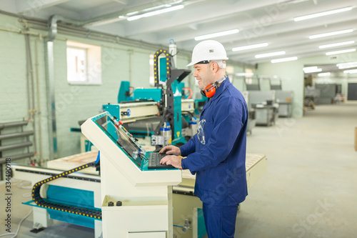 Worker in the Hard Hat Modern Factory CNC machine operator . Successful, Handsome Man in Modern Industrial Environment.Emotions, Copy Space