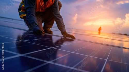 Worker Inspecting Solar Panels at Sunset