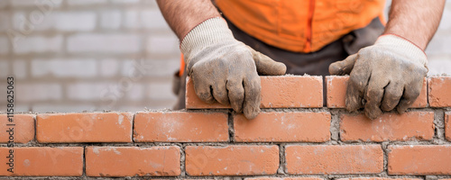 Worker making brick wall construction, copy space