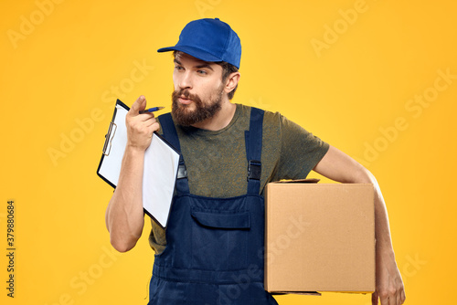 Worker male courier delivering boxes packaging documents yellow background