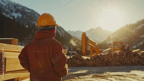 Worker Observing Sunset at Lumber Yard