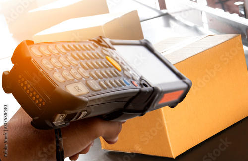 Worker scanning barcode scanner on package boxes