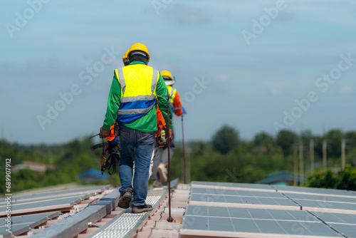 Worker Technicians are working to construct solar panels system on roof. Installing solar photovoltaic panel system. Alternative energy ecological concept. Renewable clean energy technology concept.