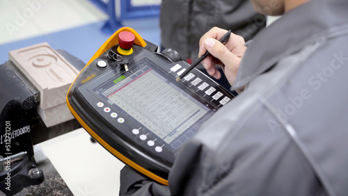Worker uses touch control panel. Scene. Skilled worker uses electronic control panel in modern enterprise. Close-up of worker setting tasks on electronic control panel