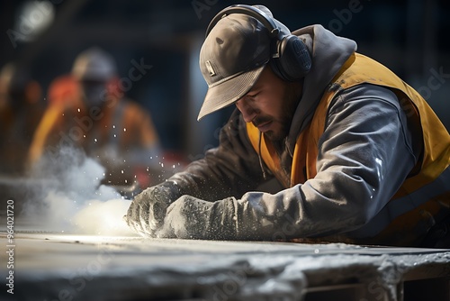 Worker working in a carpentry workshop, using a circular saw.