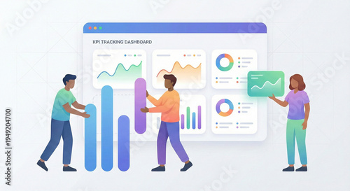 Workers building a digital KPI tracking dashboard with large charts and graphs for business performance data visualization.