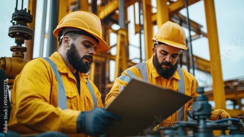Workers in safety gear inspect equipment at an industrial site during the day