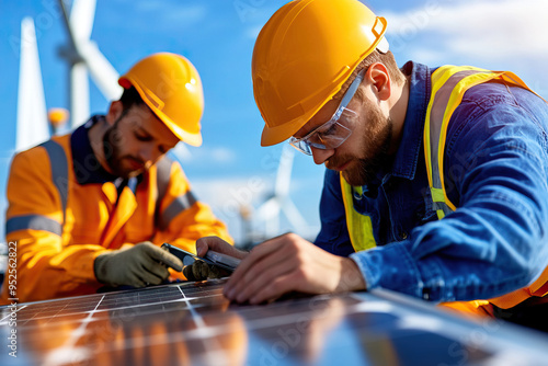 Workers installing solar panels under a clear blue sky, showcasing renewable energy and teamwork in a modern environment.