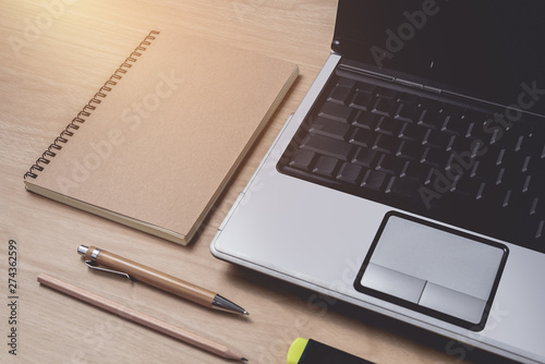 Workspace with diary or notebook and laptop, pen, pencil, hightlight pen, metal clip on wooden background