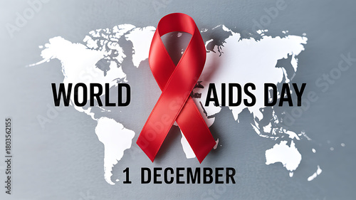 World AIDS Day Red Ribbon on Grey World Map Background world aids day aids awareness